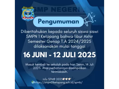 Assalamu'alaikum Warahmatullahi Wabarakatuh. Dengan berakhirnya seluruh rangkaian kegiatan pembelajaran dan evaluasi Semester Genap, kami memberitahukan kepada seluruh siswa/siswi serta Bapak/Ibu Orang