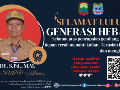 Selamat datang di website resmi SMPN 1 Ketapang, tempat di mana generasi muda dibentuk untuk menjadi pribadi yang cerdas, berakhlak mulia, dan siap menghadapi tantangan dunia. Sebagai kepala sekolah, saya merasa bangga dan terhormat dapat memimpin sekolah ini yang sudah berdiri sejak 1988, dengan visi untuk mencetak peserta didik yang tidak hanya unggul dalam prestasi akademik, tetapi juga memiliki karakter yang kuat dan berlandaskan pada nilai-nilai Pancasila.
