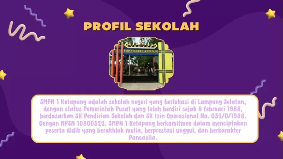 Di SMPN 1 Ketapang, kami percaya bahwa pendidikan adalah fondasi penting dalam membentuk masa depan. Oleh karena itu, kami terus berupaya mengembangkan sekolah ini melalui berbagai inovasi dalam pembelajaran, pengembangan karakter, serta kegiatan ekstrakurikuler yang dapat menggali potensi terbaik dari setiap siswa. Dengan menerapkan Kurikulum Merdeka, kami memberikan ruang yang luas bagi siswa untuk bereksplorasi dan mengembangkan minat serta bakat mereka di luar batasan akademik.