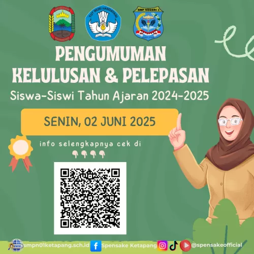 Momen yang dinantikan telah tiba. Setelah menempuh perjalanan panjang dalam menimba ilmu dan mengukir kenangan, kini saatnya Anda mengetahui hasil dari seluruh jerih payah dan proses pembelajaran yang telah dilalui. Berdasarkan Hasil Rapat Pleno Dewan Guru SMP Negeri 1 Ketapang Lampung Selatan mengenai Kelulusan Peserta Didik Tahun Pelajaran 2024/2025, dengan ini kami sampaikan informasi sebagai berikut: