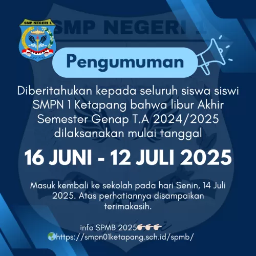 Sehubungan dengan itu, kegiatan libur akhir semester genap akan berlangsung mulai tanggal 16 Juni 2025 hingga 12 Juli 2025.